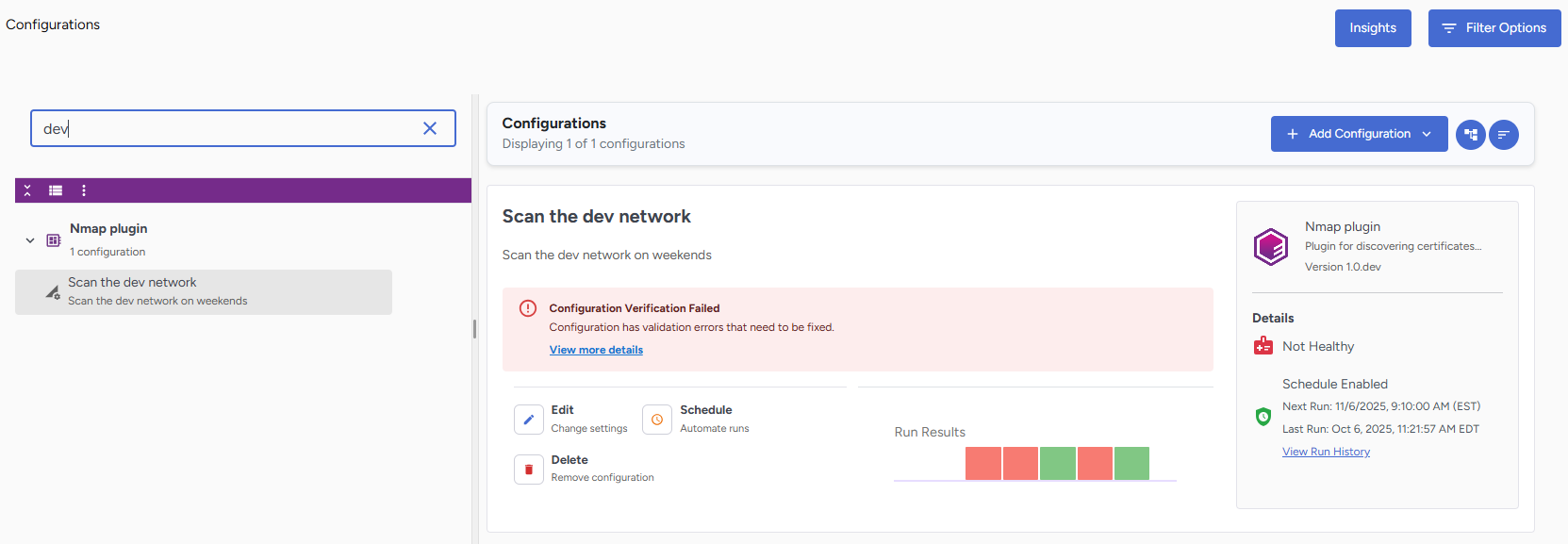 - If the configuration was run, a View Run History link will provide more information on all completed runs.