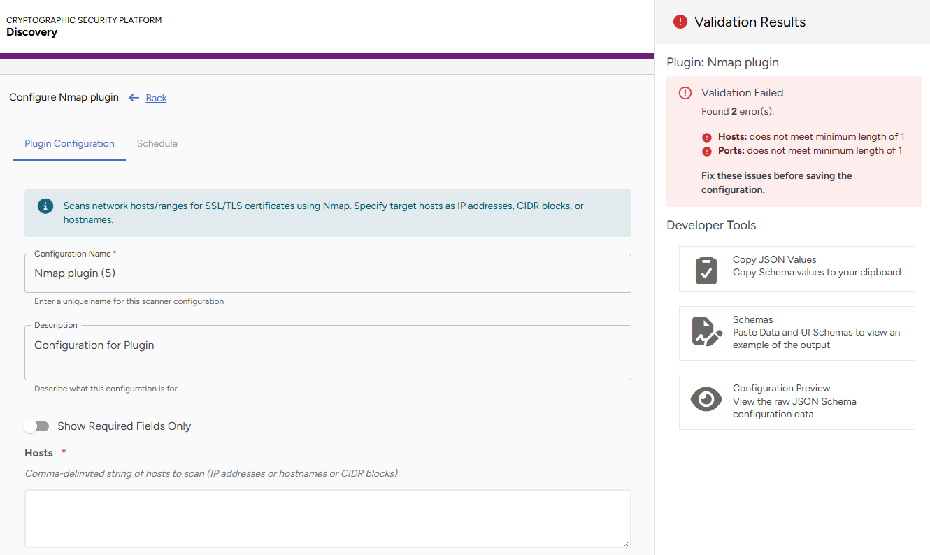 Managing Discovery Plugins Plugin configuration is divided into the following sections.Plugin ConfigurationScheduleValidation Results
