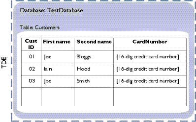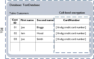 In this example, the database is encrypted with TDE, and the column of credit card numbers in the table of customers is additionally protected with CLE.
