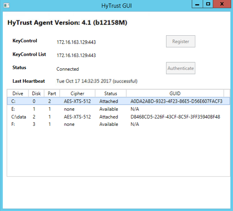 Windows disks can be encrypted or decrypted using the KeyControl webGUI, hicli, or the HyTrust Policy Agent GUI that is installed locally on the Windows server with the HyTrust DataControl Policy Agent. The HyTrust Policy Agent GUI provides basic encryption and decryption functionality without requiring the use of the KeyControl webGUI. The GUI looks similar to the following: