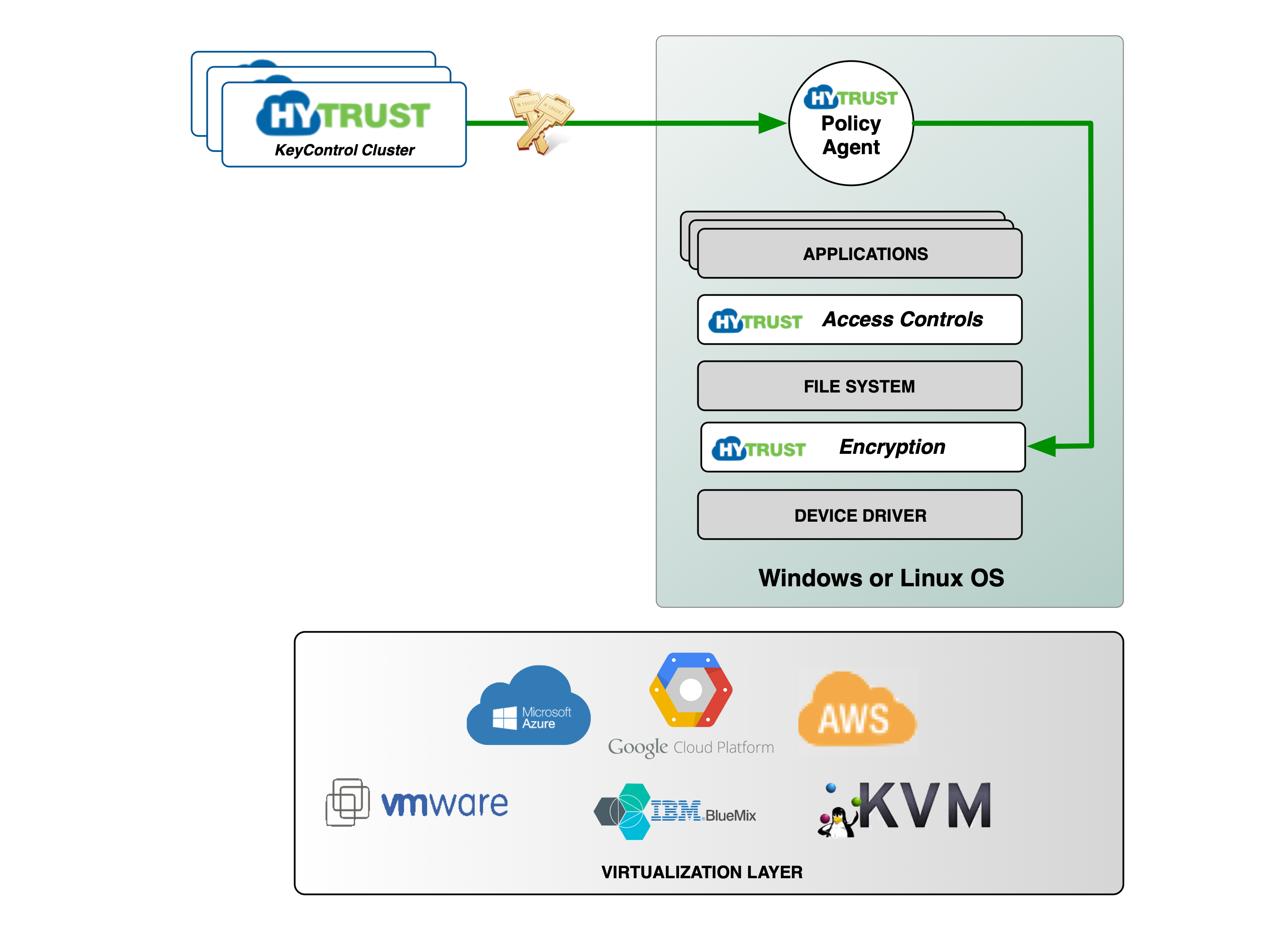 HyTrust KeyControl (KeyControl) — KeyControl stores encryption keys, policies, and configuration for any number of virtual machines with the HyTrust DataControl Policy Agent installed. You can configure KeyControl directly through the browser-based KeyControl webGUI using HTTPS, or remotely through the