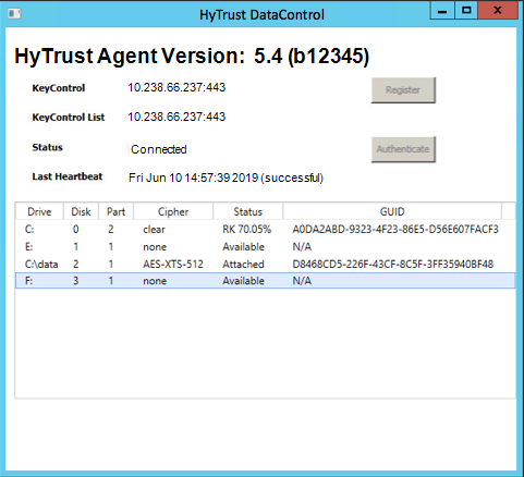 For example, the following screenshot shows that the folder mount C:\data is encrypted and attached to KeyControl, while the C: disk is 70.05% encrypted.
