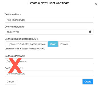 KMIPvSphereCertwith a certificate expiration date of December 31, 2019 and that uses the vSphere-generated CSR fileHyTrust-KC-1-cluster_signed_csr.pem.