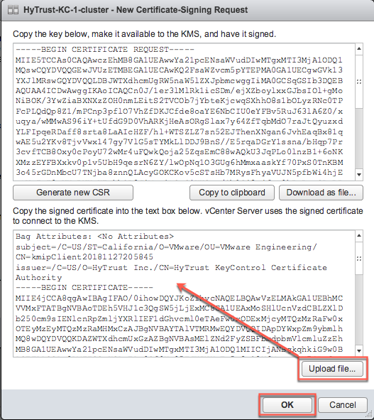 <certname>.pemfile available to upload into vCenter. In the example above the certificate file would be namedKMIPvSphereCert.pem. - Go back to the New Certificate-Signing Request dialog box in the vSphere Web Client and click Upload file.