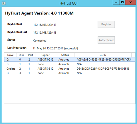 , or the HyTrust GUI that is installed locally on the Windows server with the HyTrust DataControl Policy Agent. The HyTrust GUI provides basic encryption and decryption functionality without requiring the use of the KeyControl webGUI. The GUI looks similar to the following: