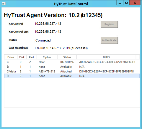 C:\datais encrypted and attached to KeyControl Vault, while theC:disk is 70.05% encrypted.The encryption proceeds in the background and you can continue to use the disk while it is being performed. If you want to change the encryption speed, see Changing the Encryption/Decryption Speed on Windows.